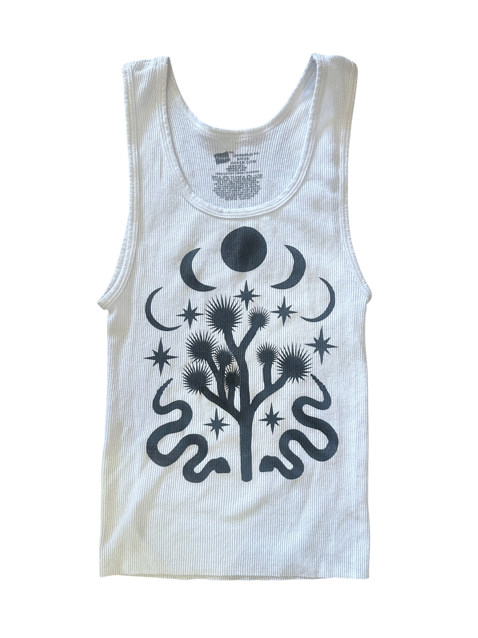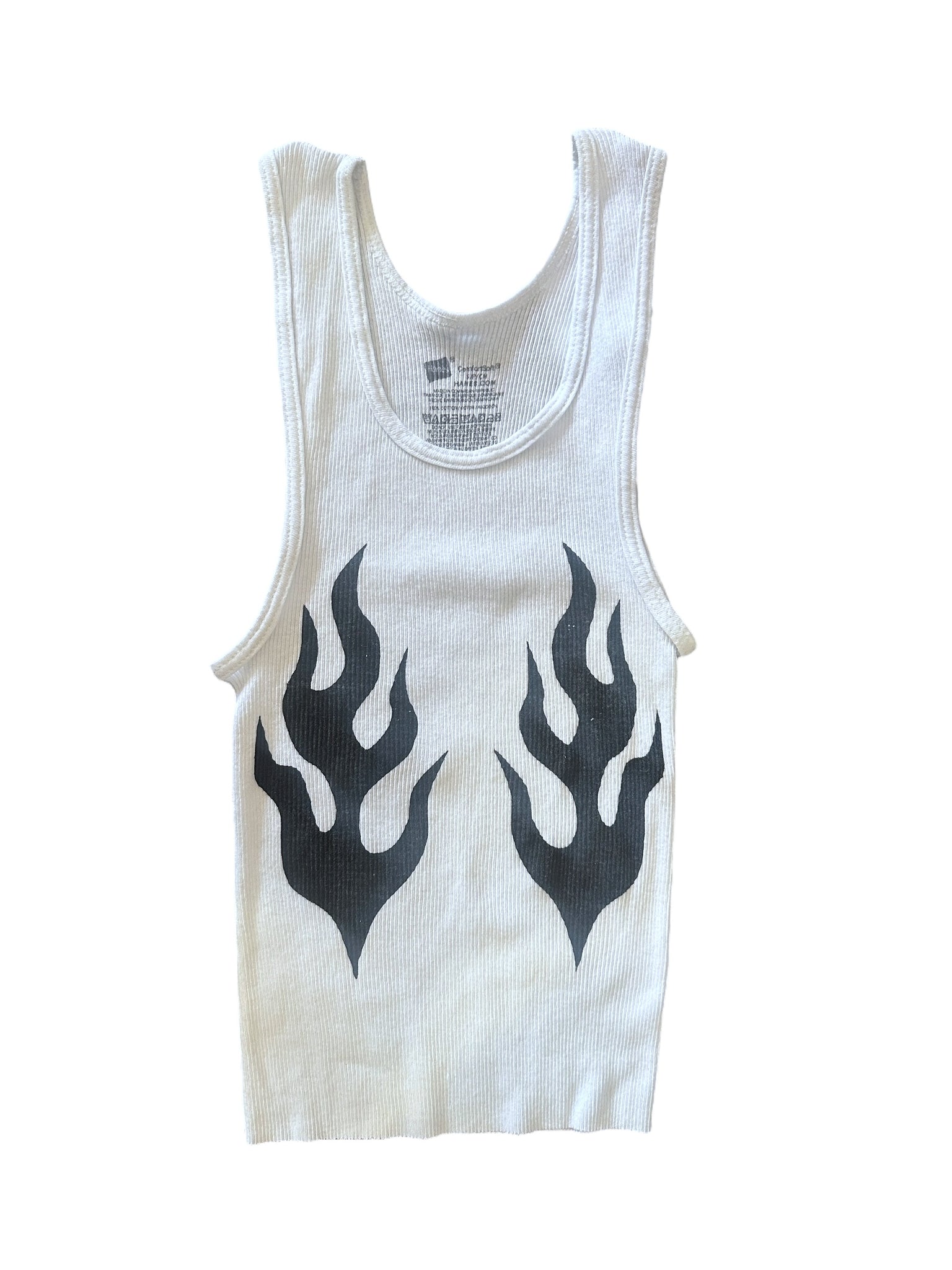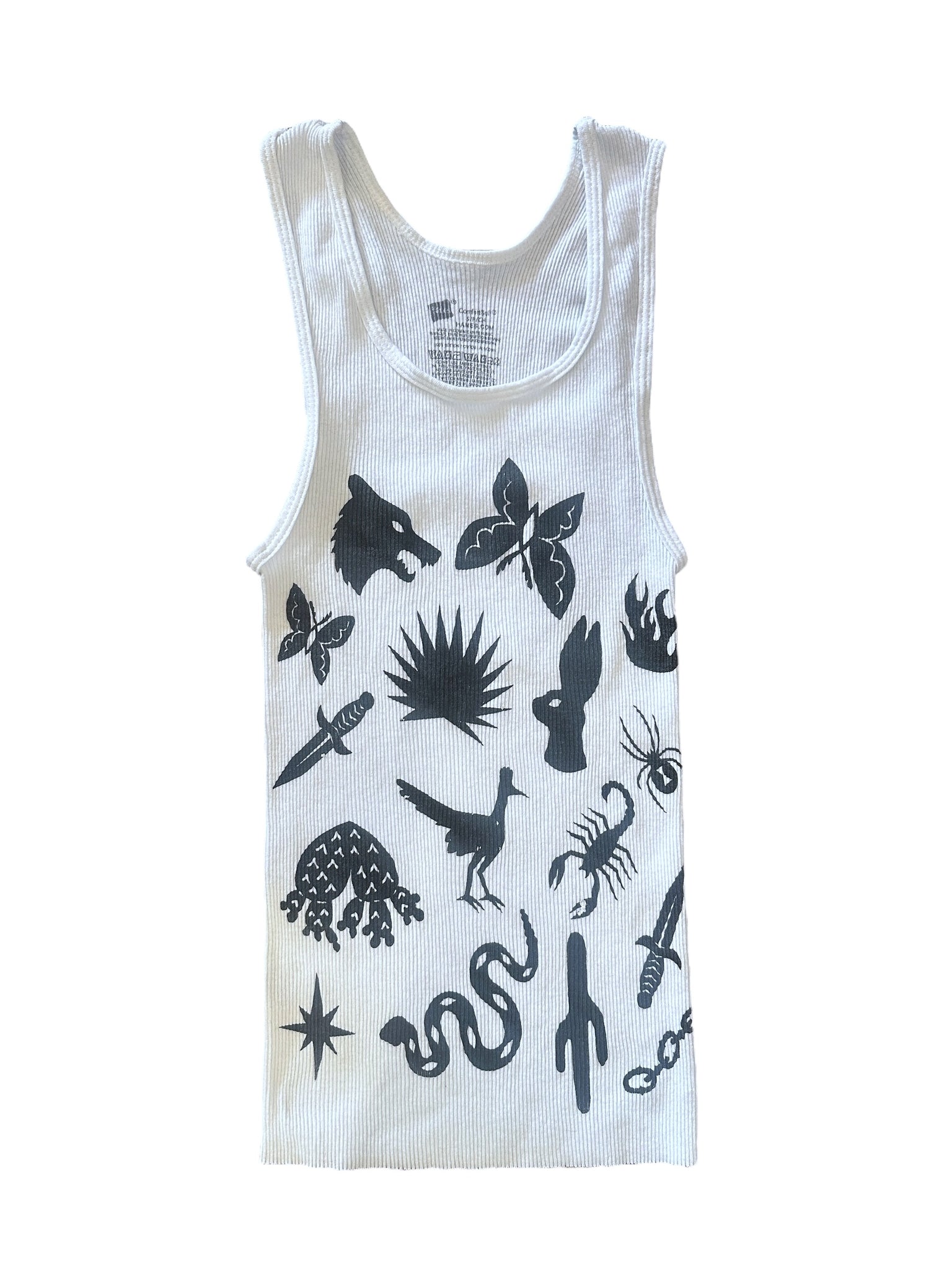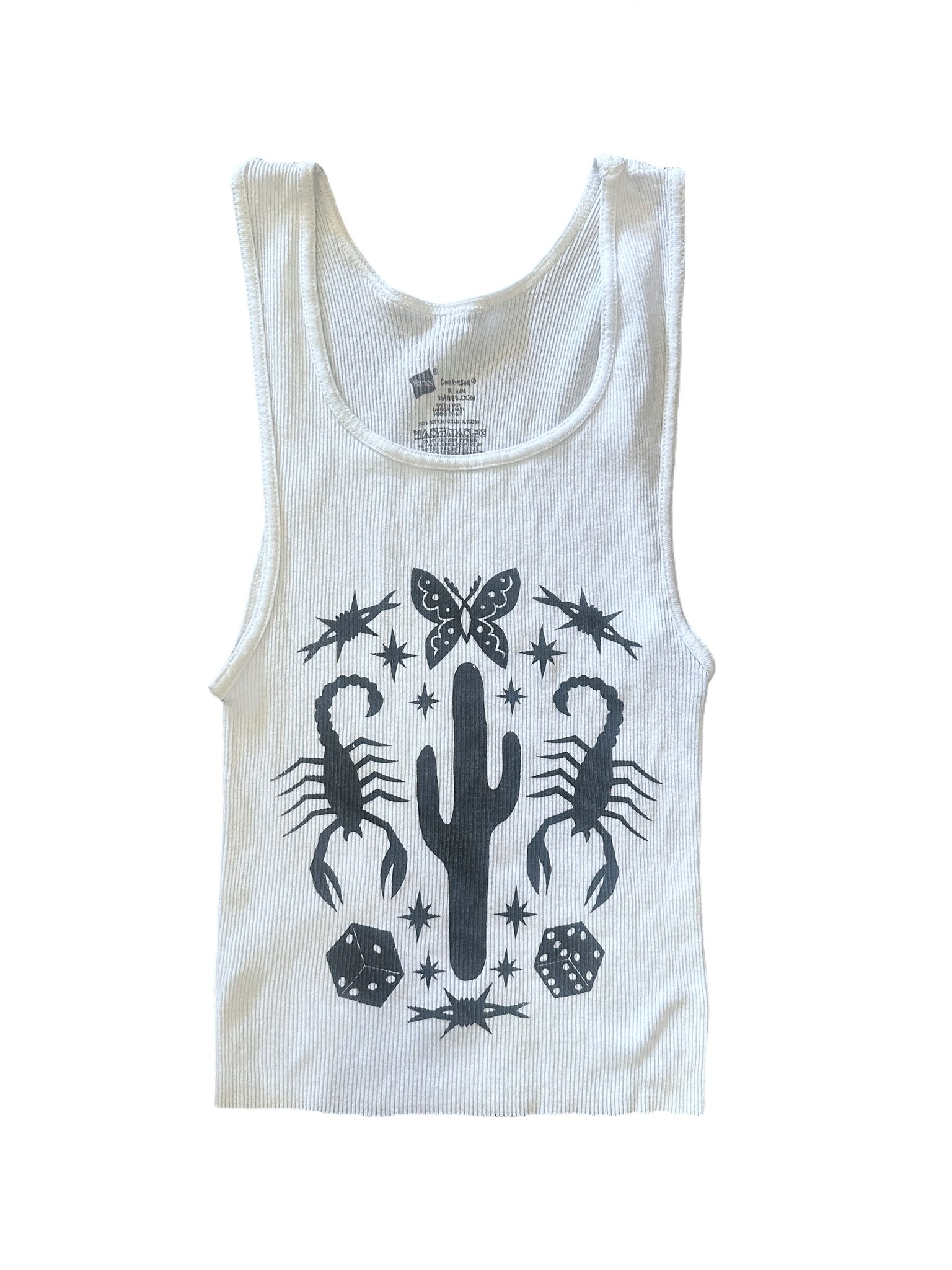 Tank top.  Silkscreened then pre-washed.  I cut them at a cropped length because they’re a whole heck of a lot cuter that way!  Soft cotton, lots of stretch.  Armholes are extended a bit below the armpit.